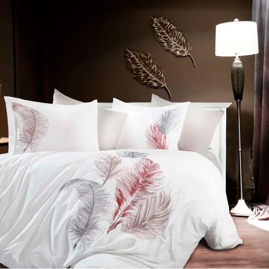 Евро: наволочки в тон простыни 50х70 см - 2 шт, наволочки с ушками и вышивкой в тон пододеяльника 50х70 см + 5 см - 2 шт, пододеяльник с вышивкой 200х220 см - 1 шт, простынь 240х260 см - 1 шт